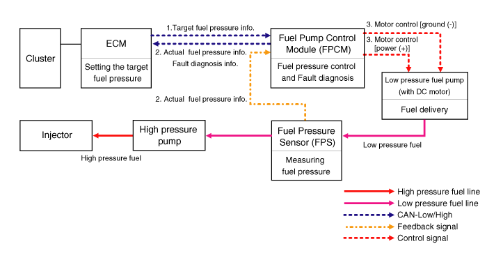 The ECM provides target fuel pressure information to the FPCM via CAN