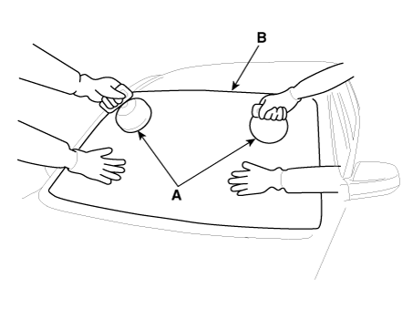 Carefully lift up the windshield glass (B) by using a glass holder (A).